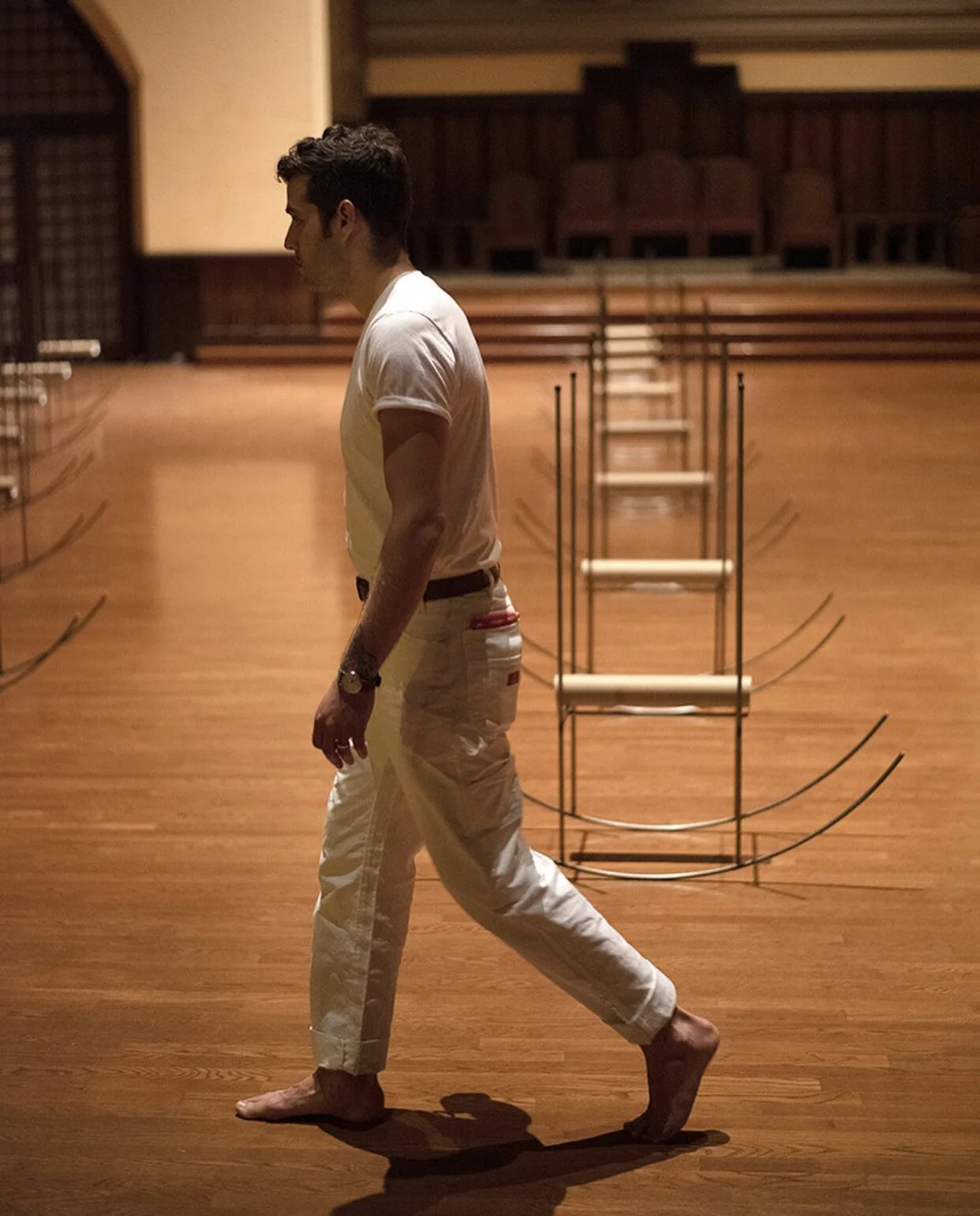 This performance took place for one night on Friday May 17, 2019 at the Trinity Center for Urban Life in Philadelphia, Pennsylvania. There was twelve performers and two conductors in matching white outfits activating twenty metal rocking structures. The structure held a simple tube with small balls that made a subtle whooshing sound upon activation. The speed of the rocking and subsequent sound was similiar to the speed of you average lullaby. The sound of one structure activated was subtle and soothing, but as more rockers were activated, the expression amounted to a wall of sound and texture transforming the church into a giant resonating instrument. The repetition lulled the viewers into a meditative state which made the silence which eventually came more profound. Whether the piece was enjoyed or understood, it allowed people to stop, reflect and experience the present inside a space without judgemnt creating a secular moment. The performance was forty five minutes and consisted of four movements. The intention of the movements were to create visual and auditory variance in speed all while building up to a crescendo of sound and movement not unlike a thunderstorm in the middle of an ocean.